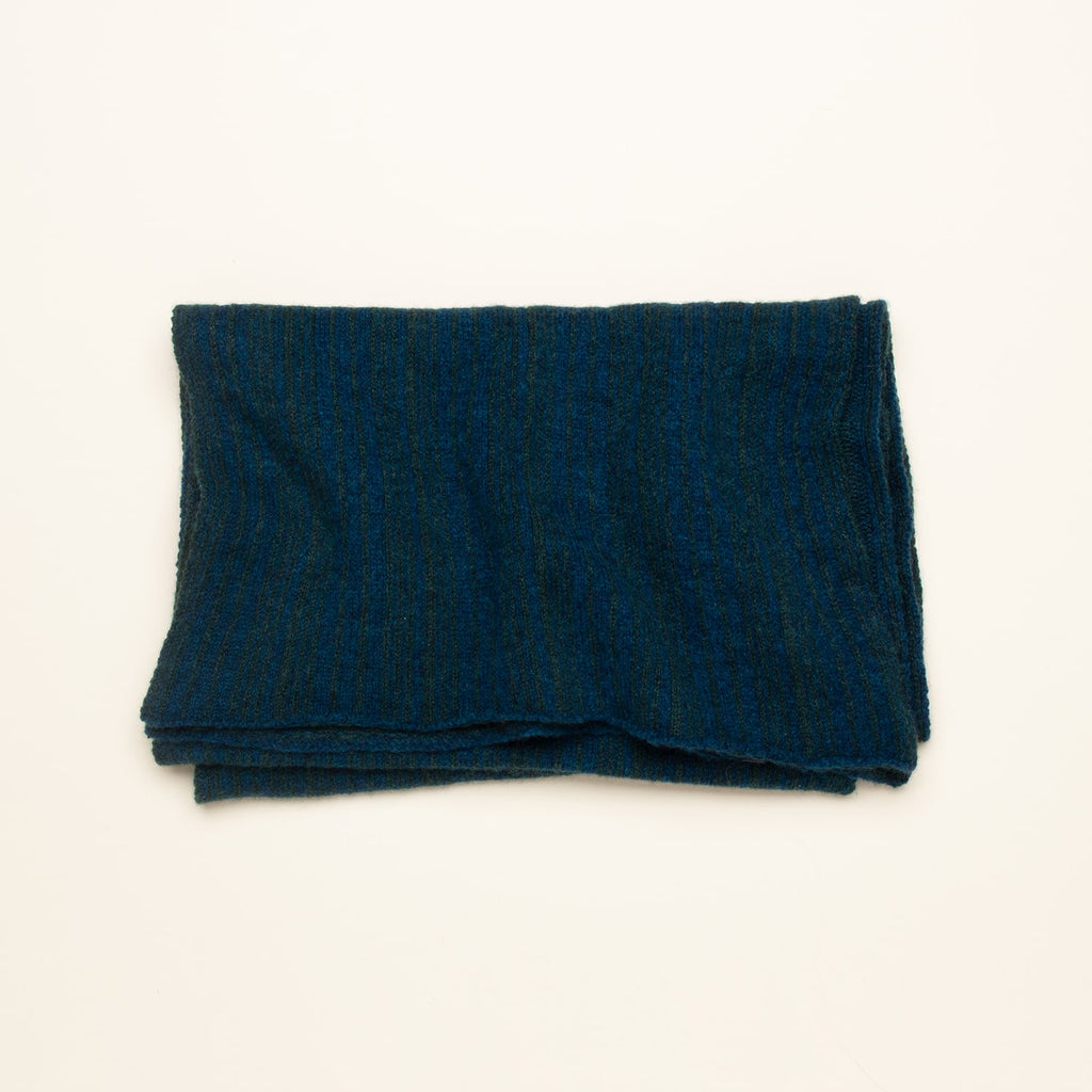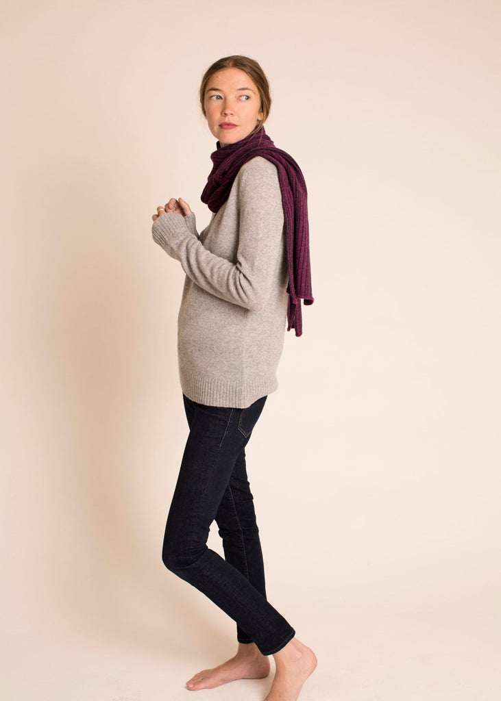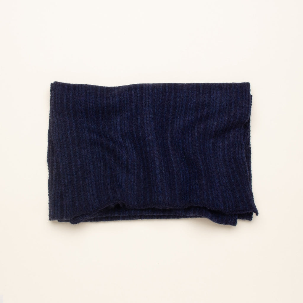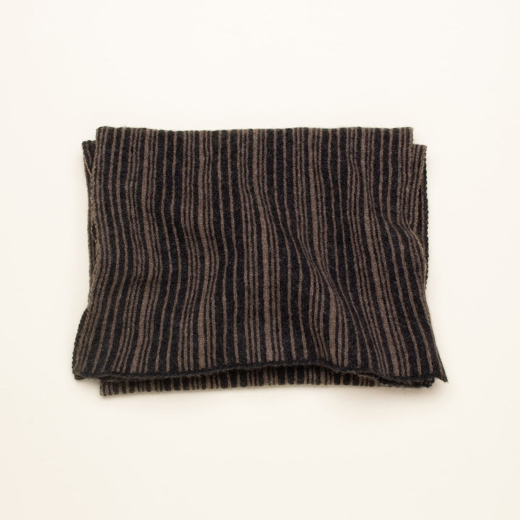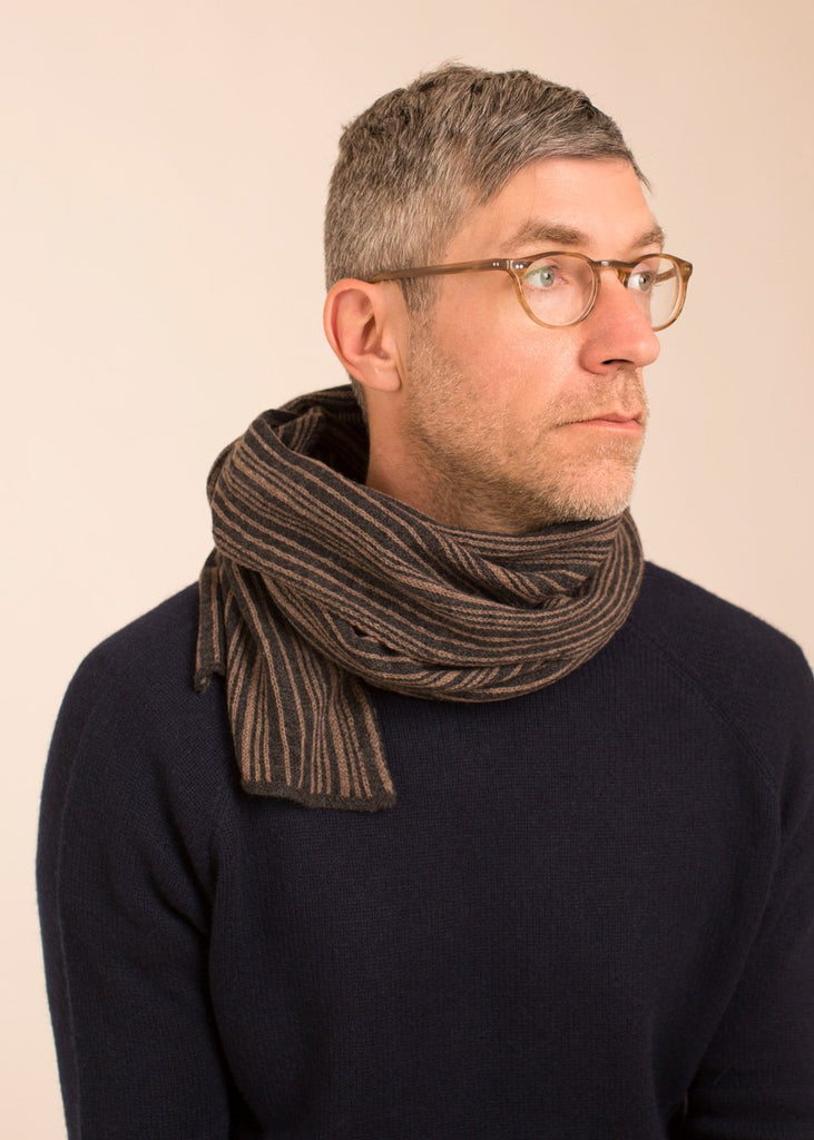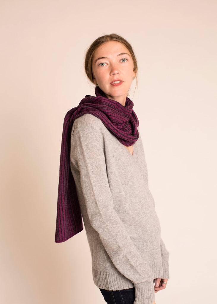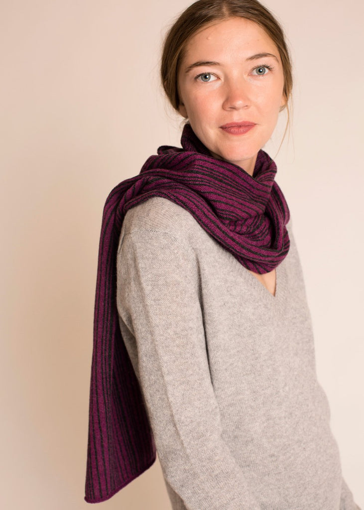 Nº 225: Unexpected delight in the details. Each scarf is totally unique, with subtle and structured color play—the front is a vertical striping in a random pattern, the backside features horizontal yarn floats. The Striped Scarf is a creative challenge for our expert knitters. A cashmere scarf that's just your own.