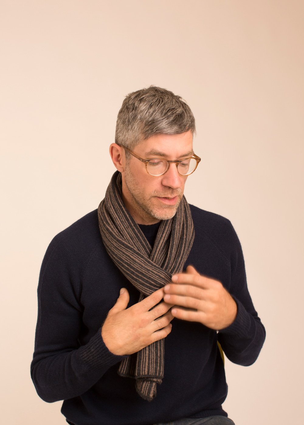 Nº 225: Unexpected delight in the details. Each scarf is totally unique, with subtle and structured color play—the front is a vertical striping in a random pattern, the backside features horizontal yarn floats. The Striped Scarf is a creative challenge for our expert knitters. A cashmere scarf that's just your own.