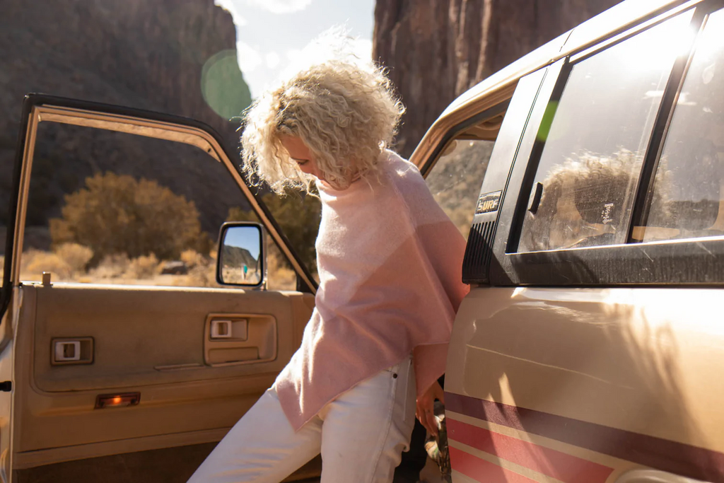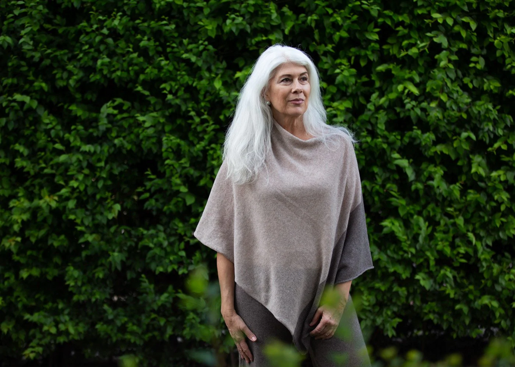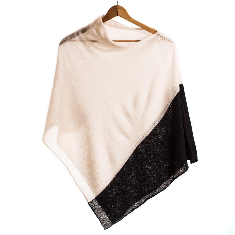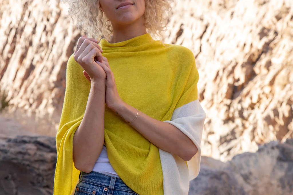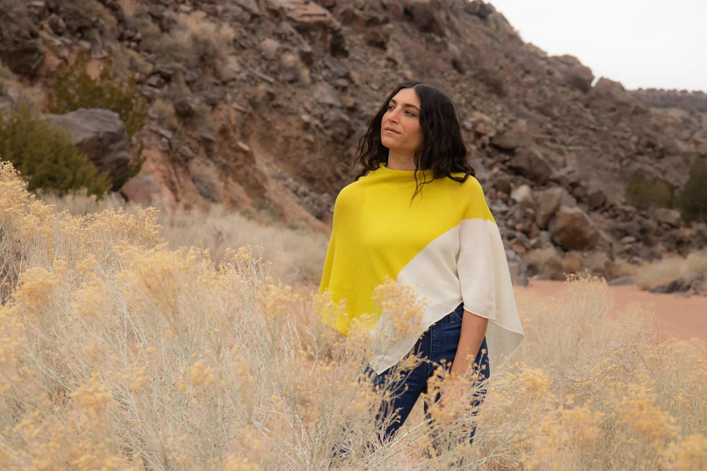 Nº 576: Our coveted Cashmere Poncho with a two-toned twist. Striking combinations transform a classic into a statement piece. We'll be changing colors with the seasons for this always limited-edition poncho. Throw it on and there you are: outside the Santa Fe Opera, your beautiful poncho floating in the desert breeze.